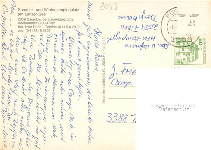 73714201 alte Postkarte Basedow Lauenburg Fliegeraufnahme Sommer- und Wintercampingplatz am Lanzer-See postalisch gelaufen Erhaltung siehe scans [LiesaD40] KatCode: 11110001053006