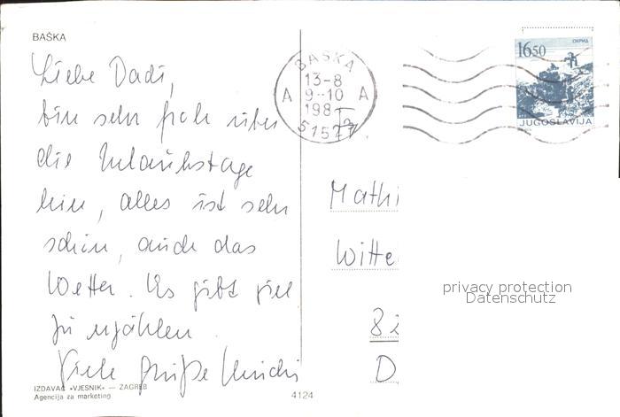 old postcard Baska Otok Krk Boote Moewe Teilansicht postalisch gelaufen Erhaltung siehe scans