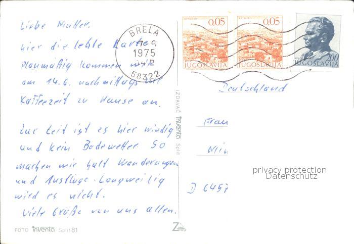old postcard Baska Voda Panorama Kueste Felsen Segeln Berge postalisch gelaufen Erhaltung siehe scans