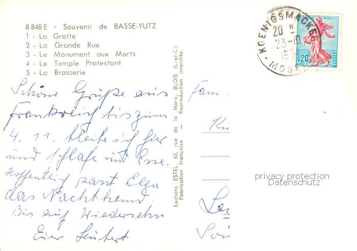 13792721 Basse-Yutz 57 Moselle Grotte Grande Rue Monument aux Morts Temple Protestant Brasserie postalisch gelaufen Erhaltung siehe scans [FriedD77] carte postale Frie Katcode 11170057757757