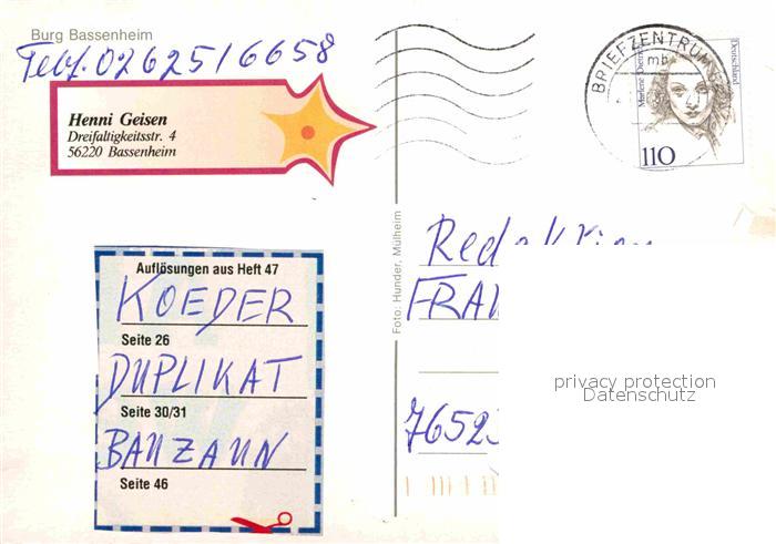 72724139 alte Postkarte Bassenheim Burg postalisch gelaufen Erhaltung siehe scans [FriedD77] KatCode: 11110007137202