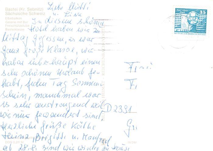 73888442 alte Postkarte Bastei Saechsische Schweiz HO Bergrestaurant Bastei Elbebalkon Galerie mit Bar Freischuetzstube Basteiklause postalisch gelaufen Erhaltung siehe scans [FriedD77] KatCode: 11110014287310