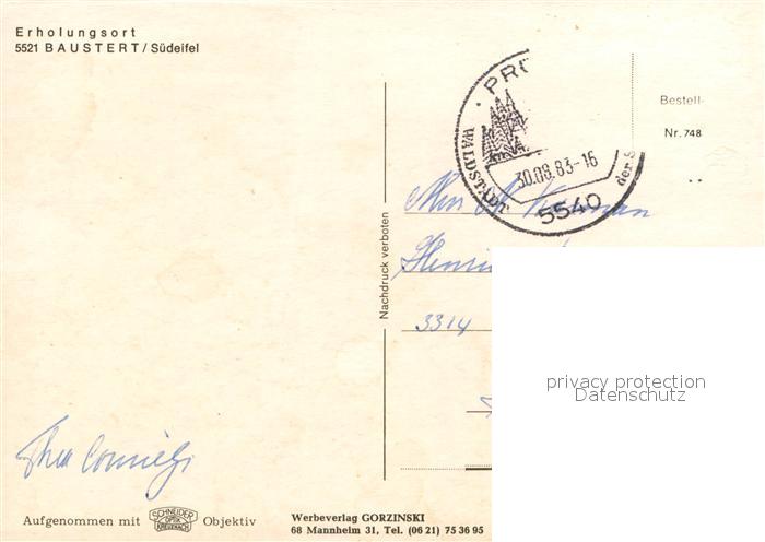 73672053 alte Postkarte Baustert Panorama Erholungsort an der Ferienstrasse Suedeifel postalisch gelaufen Erhaltung siehe scans [FriedD77] KatCode: 11110007232009