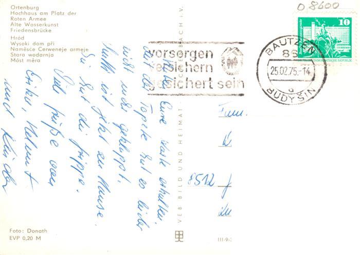73924153 Bautzen Sachsen Ortenburg Hochhaus am Platz der Roten Armee Alte Wasserkunst Friedensbruecke postalisch gelaufen Erhaltung siehe scans [FriedD77] alte Postkarte Frie Katcode 11110014272010
