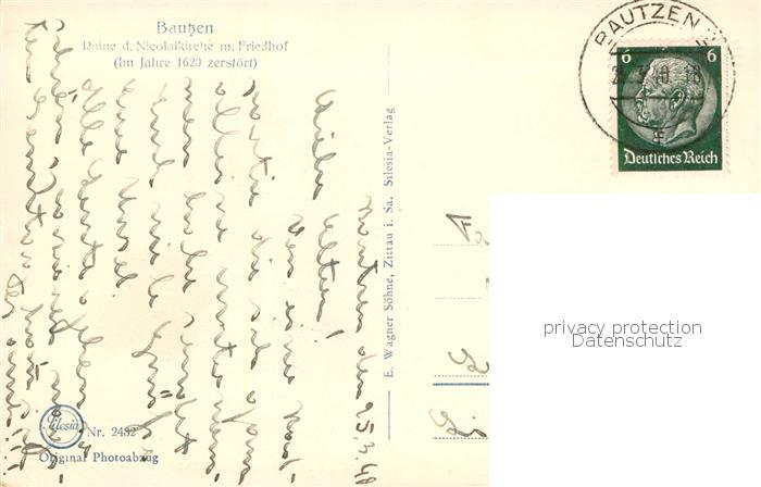 73807873 Bautzen Sachsen Ruine der Nicolaikirche mit Friedhof Silesia Karte Nr. 2432 postalisch gelaufen Erhaltung siehe scans [FriedD77] alte Postkarte Frie Katcode 11110014272010