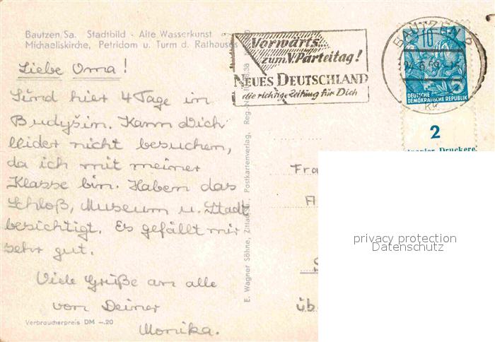 72646243 alte Postkarte Bautzen Sachsen Stadtblick Alte Wasserkunst Michaeliskirche Petridom Rathausturm postalisch gelaufen Erhaltung siehe scans [WerneD78] KatCode: 11110014272010