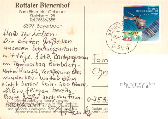 73654003 alte Postkarte Bayerbach Rott Rottaler Bienenhof postalisch gelaufen Erhaltung siehe scans [WerneD78] KatCode: 11110009277112