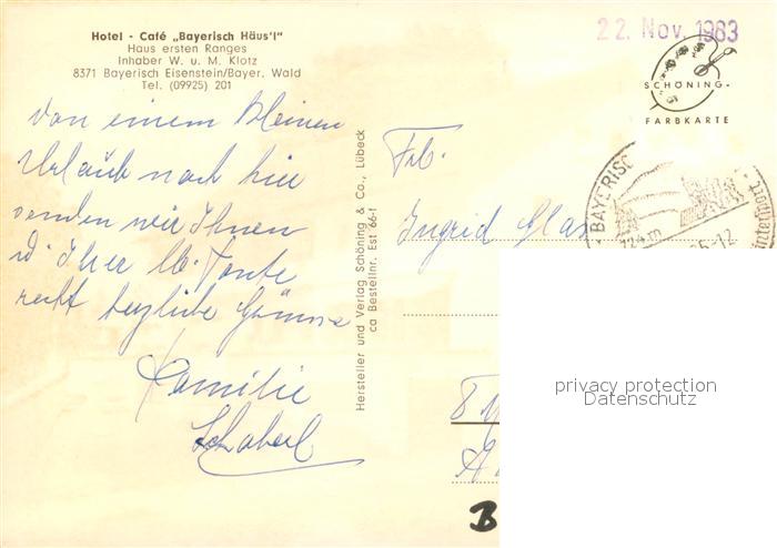 73650774 alte Postkarte Bayerisch Eisenstein Hotel Cafe Bayerisch Haeusl postalisch gelaufen Erhaltung siehe scans [WerneD78] KatCode: 11110009276115