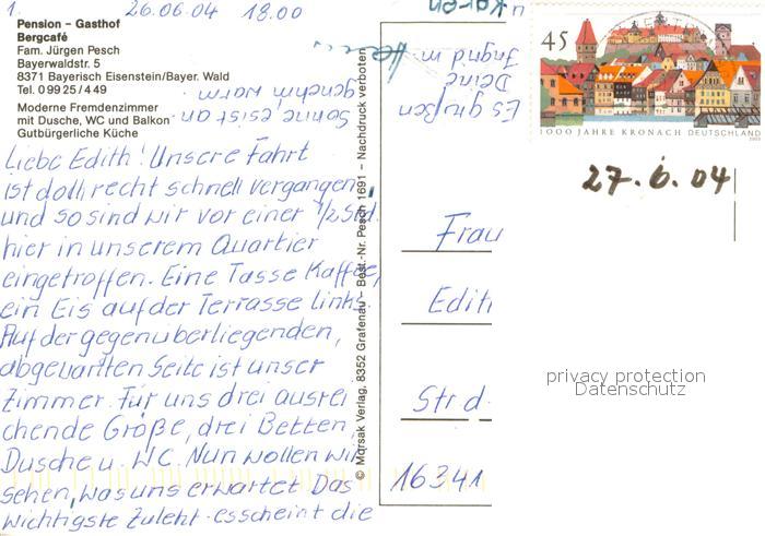 73653345 alte Postkarte Bayerisch Eisenstein Pension Gasthof Bergcafe postalisch gelaufen Erhaltung siehe scans [WerneD78] KatCode: 11110009276115