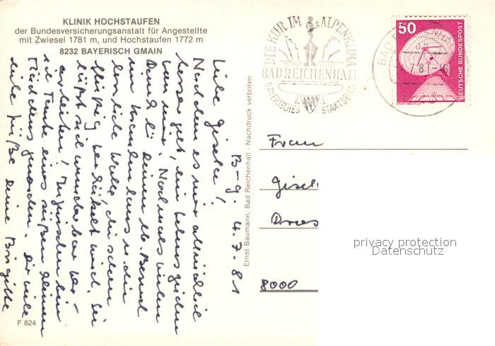 73310280 alte Postkarte Bayerisch Gmain Klinik Hochstaufen mit Zwiesel und Hochstaufen Alpen postalisch gelaufen Erhaltung siehe scans [FriedD77] KatCode: 11110009172115