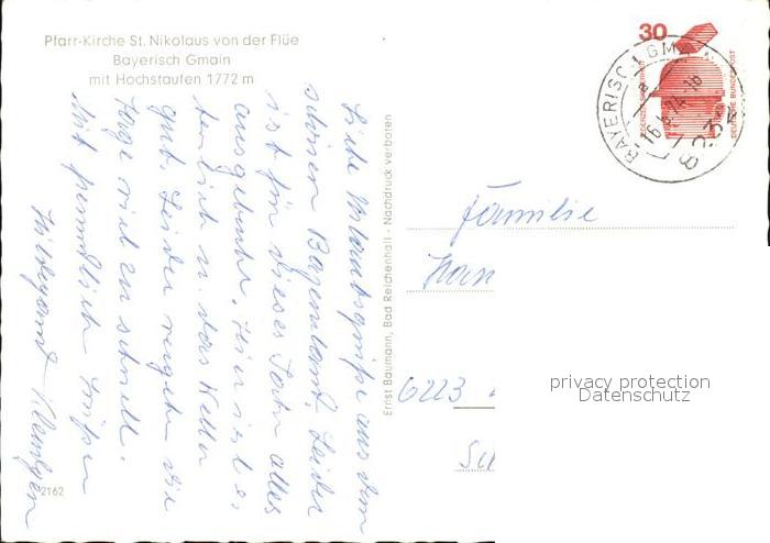 72553231 alte Postkarte Bayerisch Gmain Pfarrkirche St Nikolaus von der Fluee mit Hochstaufen postalisch gelaufen Erhaltung siehe scans [WerneD78] KatCode: 11110009172115