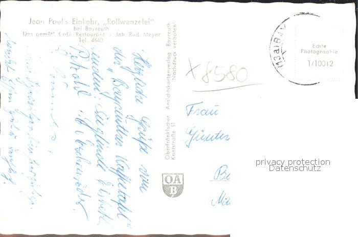41756810 alte Postkarte BAYREUTH Bayern Cafe Restaurant Einkehr Rollwenzelei postalisch gelaufen KatCode: 11110009462000