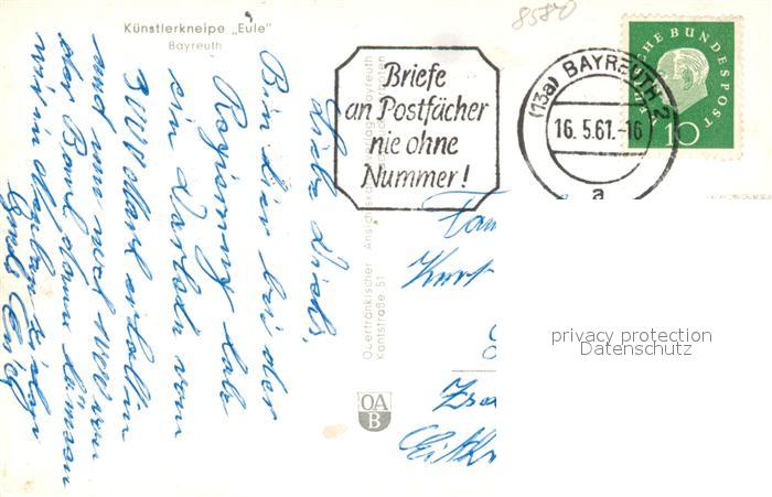 43343459 BAYREUTH Bayern Kuenstlerkneipe Eule postalisch gelaufen Erhaltung siehe scans [WerneD78] alte Postkarte Wern Katcode 11110009462000