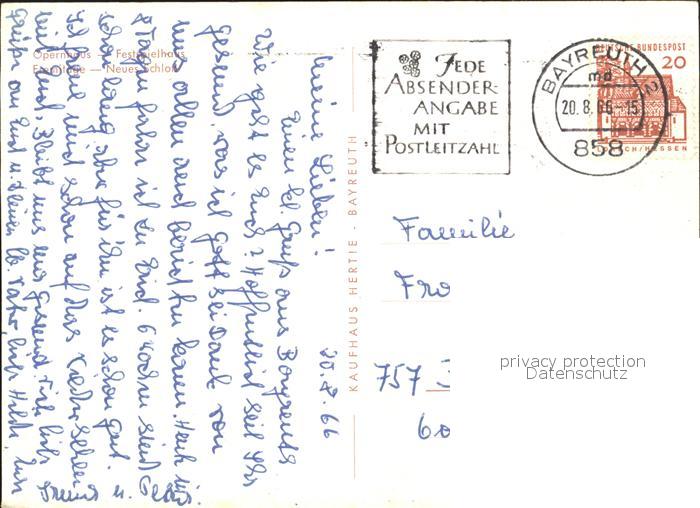 72374709 alte Postkarte Bayreuth Festspielhaus opernhaus Neues Schloss postalisch gelaufen Erhaltung siehe scans KatCode: 11110009462000
