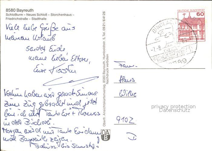 72568260 alte Postkarte Bayreuth Schlossturm Storchenhaus Friedrichstrasse Stadthalle postalisch gelaufen Erhaltung siehe scans [LiesaD40] KatCode: 11110009462000