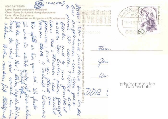 72616501 alte Postkarte Bayreuth Stadtkirche Mittelschiff Neues Schloss Markgrafenbrunnen Spitalkirche Hofgarten Storchenhaus postalisch gelaufen Erhaltung siehe scans [FriedD77] KatCode: 11110009462000
