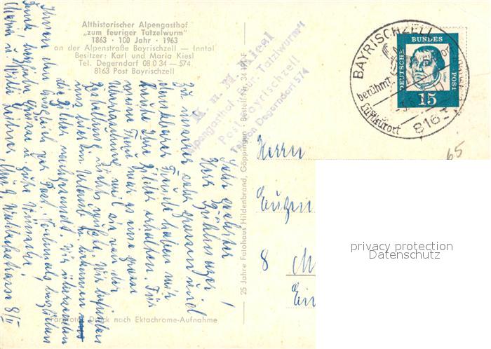 73143118 alte Postkarte Bayrischzell Alpengasthof zum feurigen Tatzelwurm postalisch gelaufen Erhaltung siehe scans [WerneD78] KatCode: 11110009182112