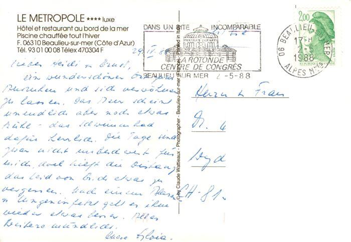 13885155 Beaulieu -sur-Mer 06 Alpes-Maritimes Le Metropole Hotel et restaurant au bord de la mer Piscine chauffee tout l Hiver postalisch gelaufen Erhaltung siehe scans [WerneD78] carte postale Wern Katcode 11170006206011