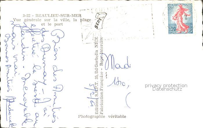 12306793 carte postale Beaulieu-sur-Mer Ville Plage Port postalisch gelaufen Erhaltung siehe scans KatCode: 11170006206011