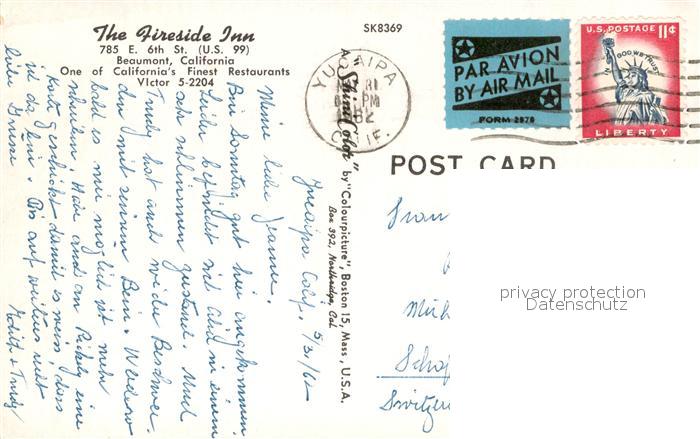 73743284 old postcard Beaumont California The Fireside Inn postalisch gelaufen Erhaltung siehe scans [WerneD78] KatCode: 14140050000000