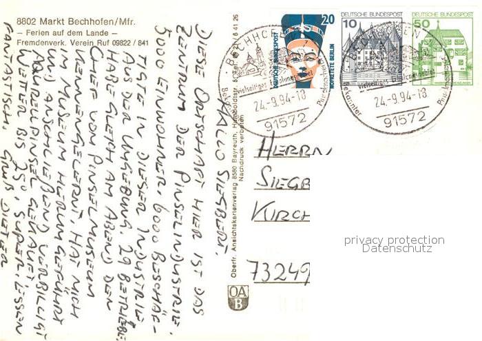 73249954 alte Postkarte Bechhofen Mittelfranken Hallenbad Kirche Kinderspielplatz Strassenpartie Uferpartie am See postalisch gelaufen Erhaltung siehe scans [FriedD77] KatCode: 11110009571115
