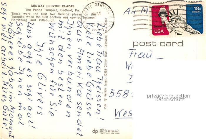 12956140 old postcard Bedford Pennsylvania Midway Service Plazas postalisch gelaufen Erhaltung siehe scans [NatalD47] KatCode: 14140410000000