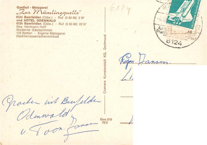 73890632 alte Postkarte Beerfelden Odenwald Gasthof Metzgerei Zur Muemlingquelle postalisch gelaufen Erhaltung siehe scans [WerneD78] KatCode: 11110006437002