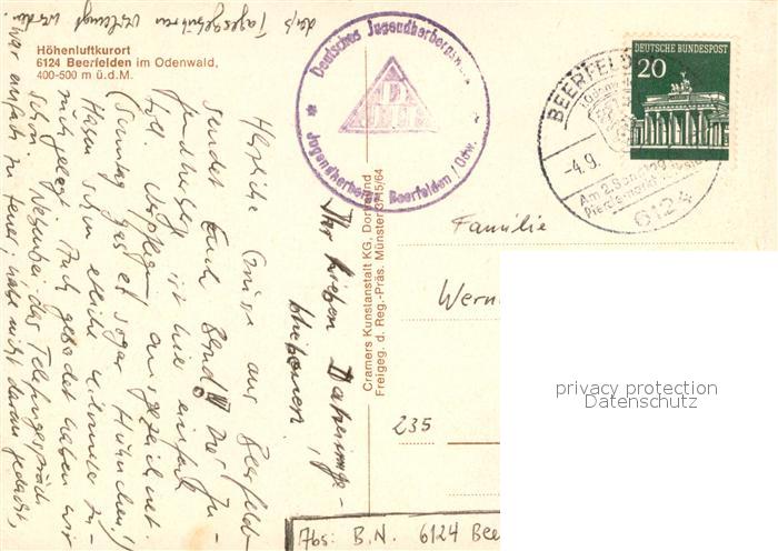 73687272 alte Postkarte Beerfelden Odenwald Hoehenluftkurort Fliegeraufnahme postalisch gelaufen Erhaltung siehe scans [FriedD77] KatCode: 11110006437002