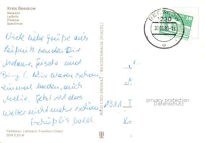 73067187 alte Postkarte Beeskow Am Schwielochsee Niewisch Leissnitz Pieskow Speichrow postalisch gelaufen Erhaltung siehe scans [WerneD78] KatCode: 11110012067036