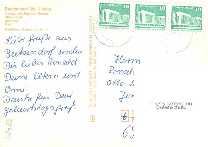 72915057 alte Postkarte Beetzendorf Stoelpenbad Steinweg Post Oberschule-Friedrich-Engels postalisch gelaufen Erhaltung siehe scans [LiesaD40] KatCode: 11110015081045