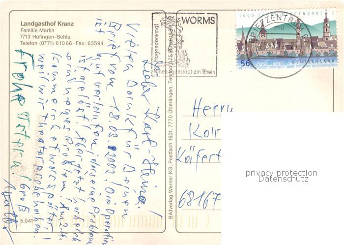 73759938 alte Postkarte Behla Landgasthof Kranz postalisch gelaufen Erhaltung siehe scans [FriedD77] KatCode: 11110008326027
