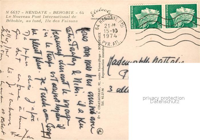 13521957 carte postale Behobie Nouveau Pont International Ile des Faisans postalisch gelaufen Erhaltung siehe scans [KathaD81] KatCode: 11170064164545
