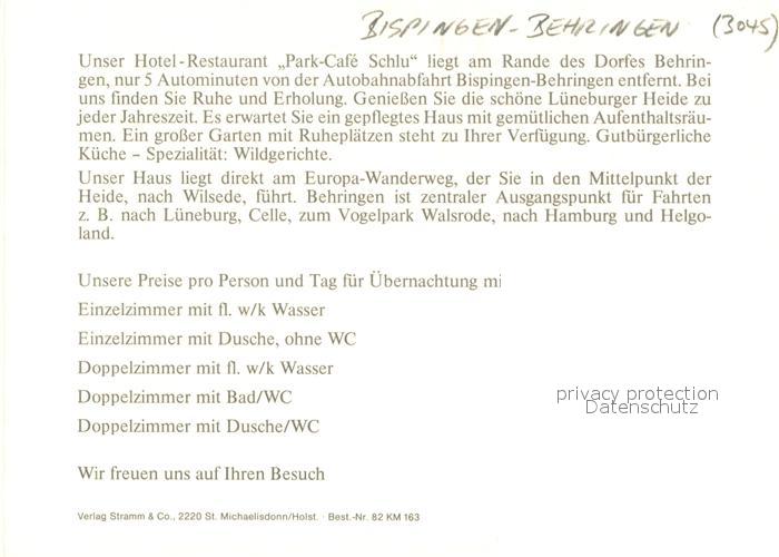 73725974 Behringen Bispingen Hotel Restaurant Park Cafe Schlu postalisch nicht gelaufen Werbekarte (keine Postkarte) Erhaltung siehe scans [FriedD77] KatCode: 11110003358002
