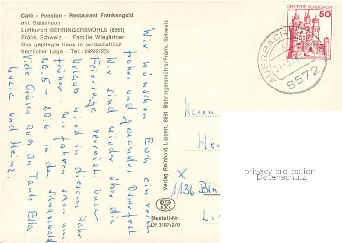 73653046 alte Postkarte Behringersmuehle Cafe Pension Restaurant Frankengold postalisch gelaufen Erhaltung siehe scans [WerneD78] KatCode: 11110009474129