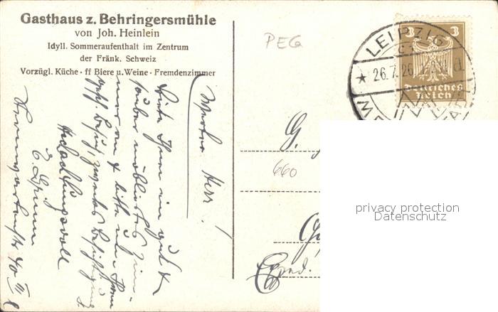 31704858 alte Postkarte Behringersmuehle Gasthaus z. Behringesmuehle postalisch gelaufen Erhaltung siehe scans KatCode: 11110009474129