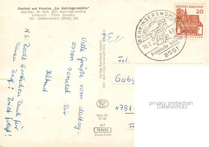 73660357 alte Postkarte Behringersmuehle Gasthof Pension Zur Behringersmuehle Felsen postalisch gelaufen Erhaltung siehe scans [FriedD77] KatCode: 11110009474129