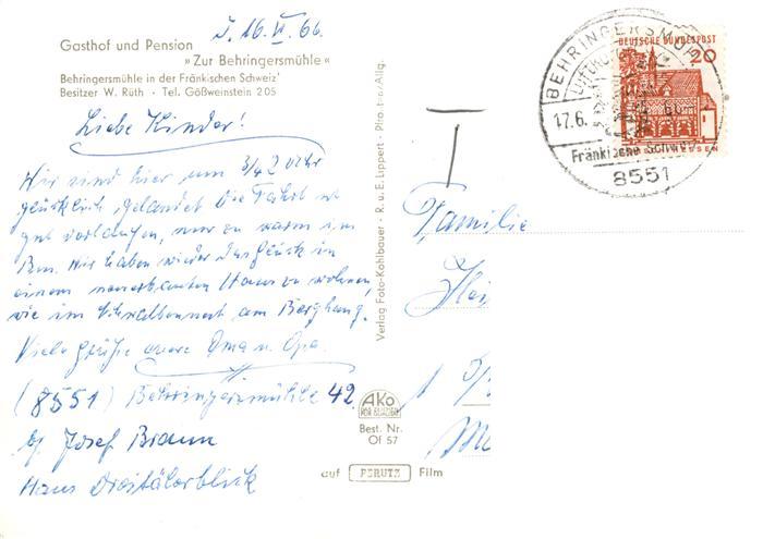 73887290 alte Postkarte Behringersmuehle Goessweinstein Gasthof Pension Zur Behringersmuehle postalisch gelaufen Erhaltung siehe scans [FriedD77] KatCode: 11110009474129
