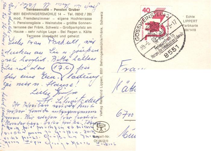 73932173 alte Postkarte Behringersmuehle Goessweinstein Terrassencafe Pension Pension Gruber postalisch gelaufen Fliegeraufnahme Erhaltung siehe scans [WerneD78] KatCode: 11110009474129