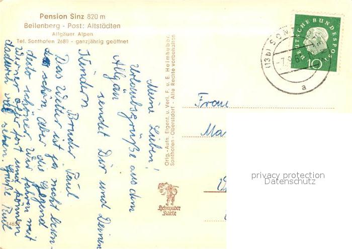 33050542 alte Postkarte Beilenberg Pension Sinz postalisch gelaufen Erhaltung siehe scans [NatalD47] KatCode: 11110009780139