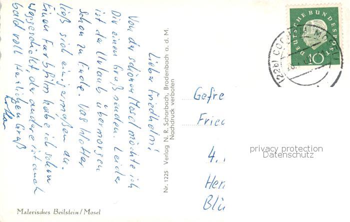 73835286 alte Postkarte Beilstein Mosel Blick ueber die Mosel Burgruine postalisch gelaufen Erhaltung siehe scans [FriedD77] KatCode: 11110007135007