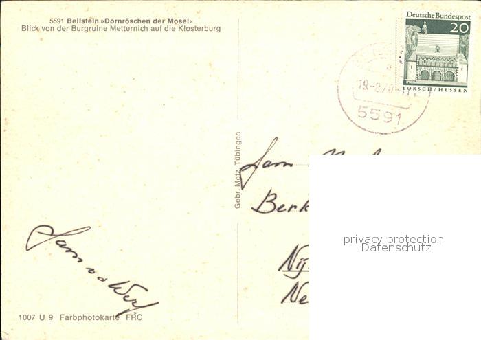 72494595 alte Postkarte Beilstein Mosel Blick von der Burgruine Metternich zur Klosterburg postalisch gelaufen Erhaltung siehe scans KatCode: 11110007135007