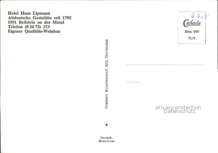 72346678 Beilstein Mosel Hotel Haus Lipmann altdeutsches Restaurant postalisch nicht gelaufen Erhaltung siehe scans KatCode: 11110007135007