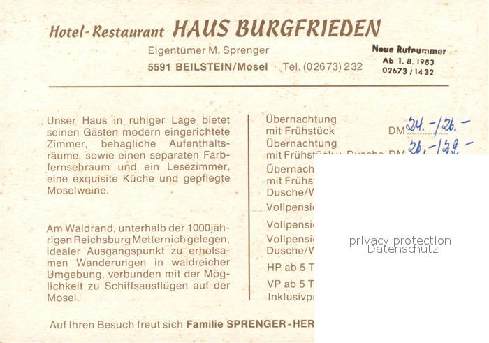73323323 Beilstein Mosel Hotel Restaurant Haus Burgfrieden postalisch nicht gelaufen Werbekarte (keine Postkarte) Erhaltung siehe scans [FriedD77] KatCode: 11110007135007