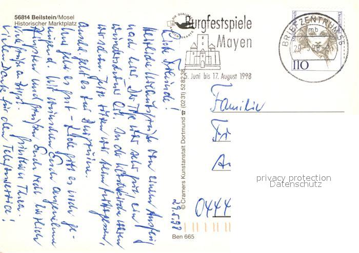 72987660 alte Postkarte Beilstein Mosel Marktplatz Fachwerk postalisch gelaufen Erhaltung siehe scans [LiesaD40] KatCode: 11110007135007