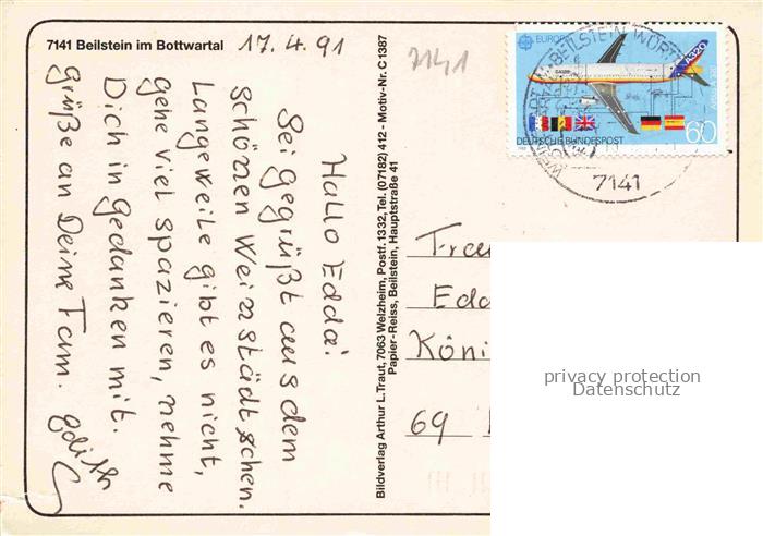 74053193 alte Postkarte Beilstein Wuerttemberg Burgfalkner Panorama Rathaus Weinlese Mineralfreibad Magdalenenkirche postalisch gelaufen Erhaltung siehe scans [WerneD78] KatCode: 11110008125008