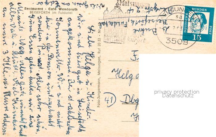 73792887 alte Postkarte Beisefoerth Malsfeld Restaurant-Cafe Wenderoth postalisch gelaufen Erhaltung siehe scans [LiesaD40] KatCode: 11110006634013