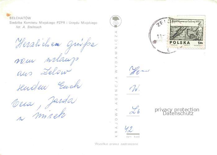 74086722 old postcard Belchatow Belchental LODZ Litzmannstadt PL Siedziba Komitetu Miejskiego PZPR i Urzedu Miejskiego postalisch gelaufen Erhaltung siehe scans [WerneD78] KatCode: 11410