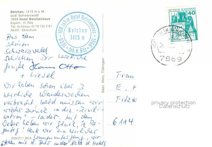 72793270 alte Postkarte Belchen Baden Hotel Belchenhaus postalisch gelaufen Erhaltung siehe scans [LiesaD40] KatCode: 11110008336060