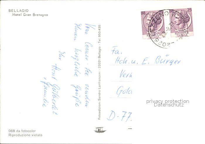old postcard Bellagio Lago di Como Hotel Gran Bretagna postalisch gelaufen Erhaltung siehe scans