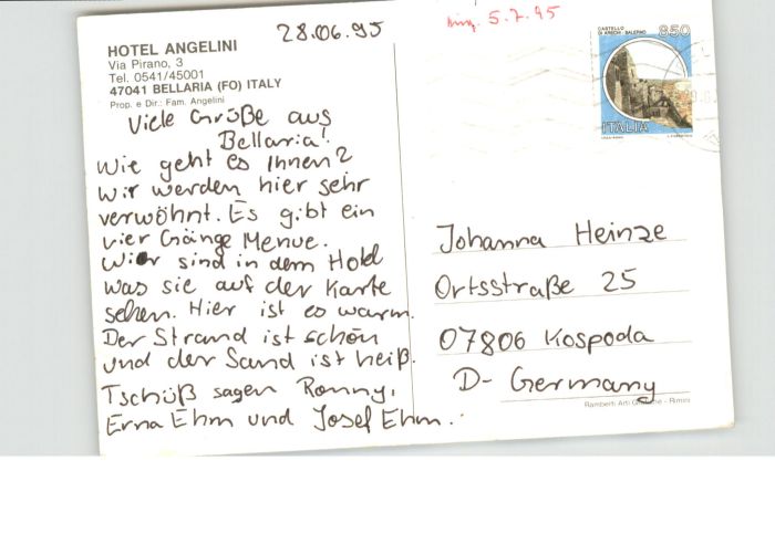 old postcard Bellaria Hotel Angelini postalisch gelaufen